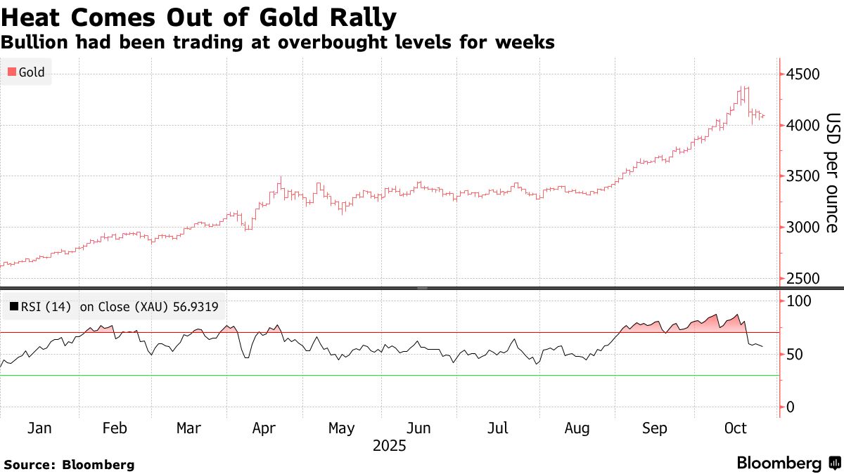 Đợt tăng giá mạnh mẽ đã đẩy vàng lên mức cao kỷ lục trên 4,380 USD/ounce vào thứ Hai tuần trước đã đảo chiều do có dấu hiệu kim loại này bị quá mua. Tuy nhiên, vàng vẫn tăng khoảng 55% trong năm nay, nhờ vào hoạt động mua vào của các ngân hàng trung ương và "debasement trade" — trong đó các nhà đầu tư tránh nợ chính phủ và tiền tệ để bảo vệ mình khỏi thâm hụt ngân sách vượt tầm kiểm soát.