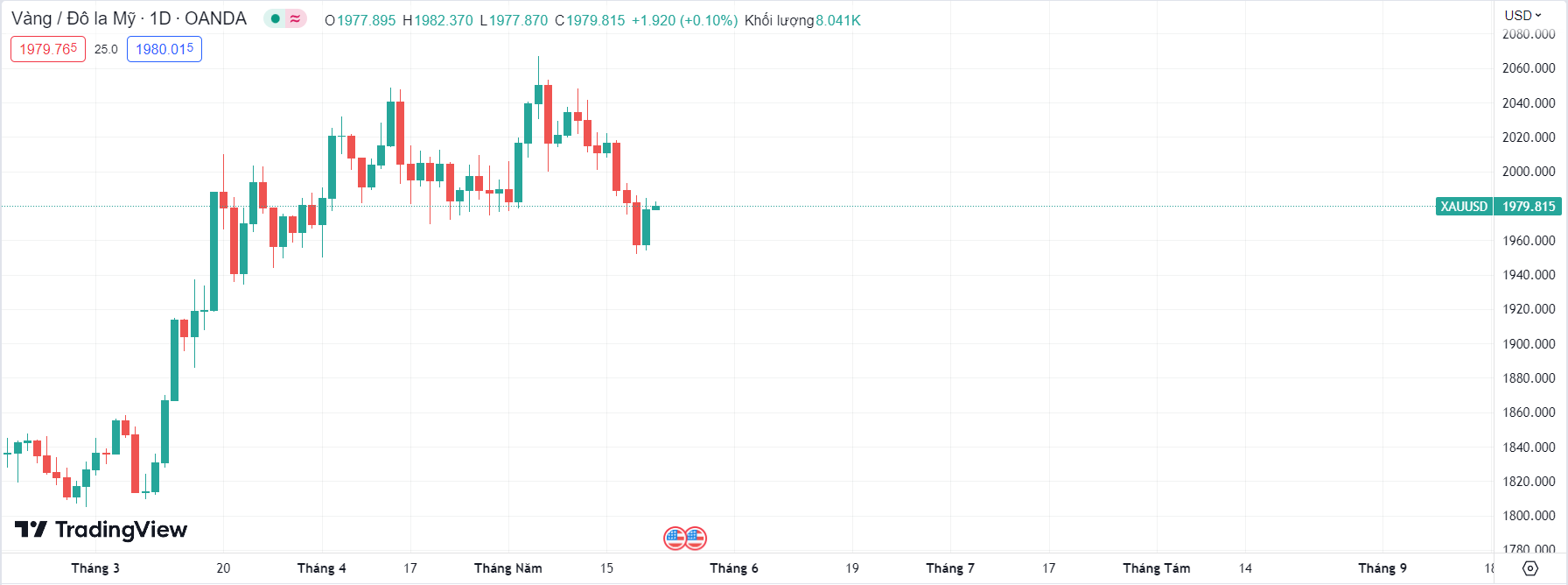 Hiện tại, vàng đang tiếp tục giao dịch quanh mức $1,980/oz.