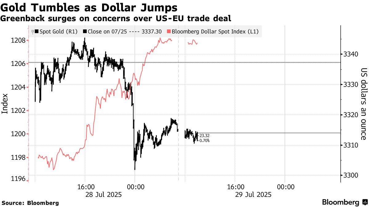 Vàng giữ mức giảm sau khi đồng USD tăng mạnh nhất kể từ tháng 5 nhờ thỏa thuận thuế quan giữa Mỹ và Liên minh Châu Âu, với các nhà đầu tư hiện đang tập trung vào triển vọng gia hạn lệnh đình chiến thương mại giữa Washington và Bắc Kinh.