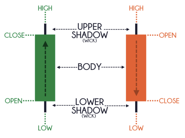 Mỗi một cây nến sẽ cho ta biết thông tin cơ bản nhất về biến động của tài sản như: giá đóng cửa, giá mở cửa, mức giá cao nhất, mức giá thấp nhất trong phiên giao dịch. Hơn nữa, màu sắc của nến, độ dài thân và râu nến đều có thể cho biết phe mua/bán đang áp đảo trên thị trường.
