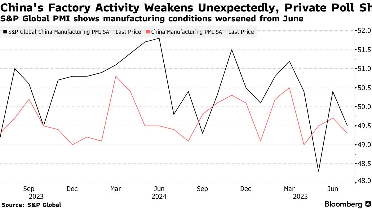 Chỉ số PMI sản xuất của S&P Global cho Trung Quốc đã giảm xuống 49.5 từ mức 50.4 trong tháng 6, theo một thông báo được công bố vào thứ Sáu, so với dự báo trung bình là 50.2 của các nhà kinh tế.