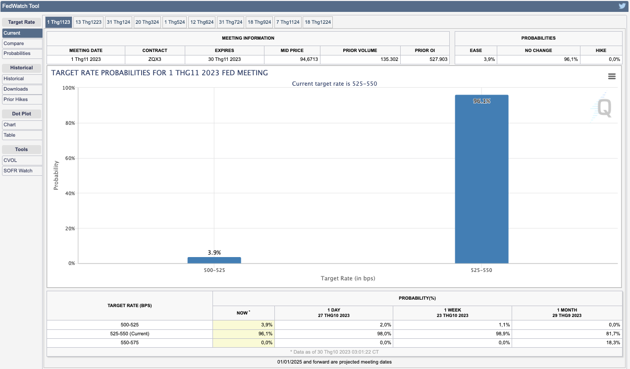Ví dụ, vào ngày 29/07/2023, FedWatch dựa trên giá của HĐTL tháng 9/2023, ước tính xác suất Fed giữ nguyên phạm vi lãi suất (5.25 - 5.50%) trong cuộc họp tháng 9 là khoảng 80%, trong khi khả năng tăng lãi suất chỉ vỏn vẹn 20%.