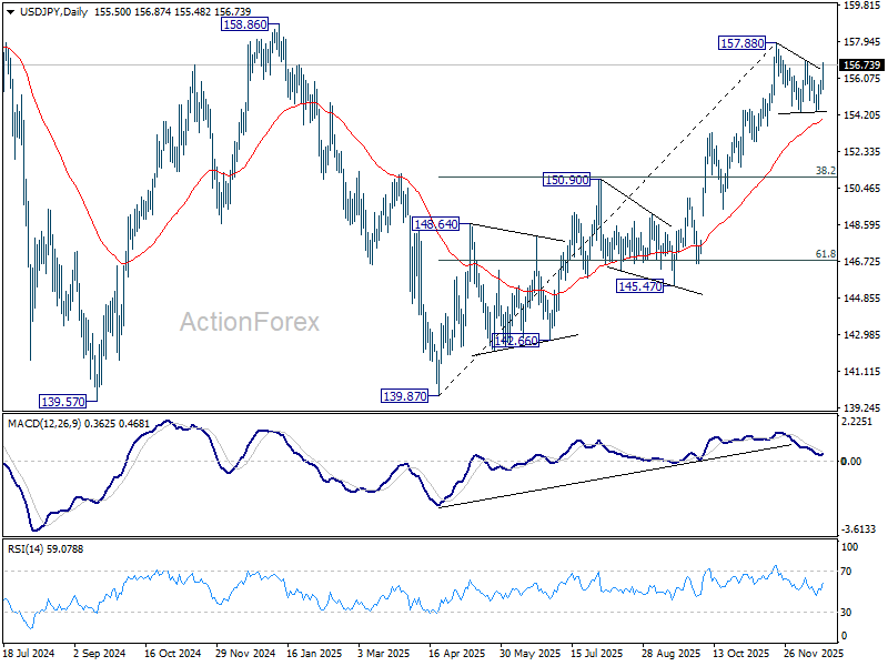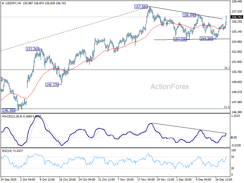 Trọng tâm trước mắt của USD/JPY hiện nằm tại vùng kháng cự 156.94 sau nhịp tăng mạnh trong ngày. Việc phá vỡ dứt khoát mốc này sẽ củng cố quan điểm rằng đà tăng lớn hơn từ đáy 139.87 đang được nối lại, hướng lên 157.88 và xa hơn là vùng kháng cự cấu trúc quan trọng tại 158.85. Nếu mốc này bị chinh phục một cách rõ ràng, đó sẽ là tín hiệu tăng giá trung hạn rất mạnh. Rủi ro hiện vẫn nghiêng về phía tăng chừng nào vùng hỗ trợ 154.38 còn được giữ vững trong các nhịp điều chỉnh.