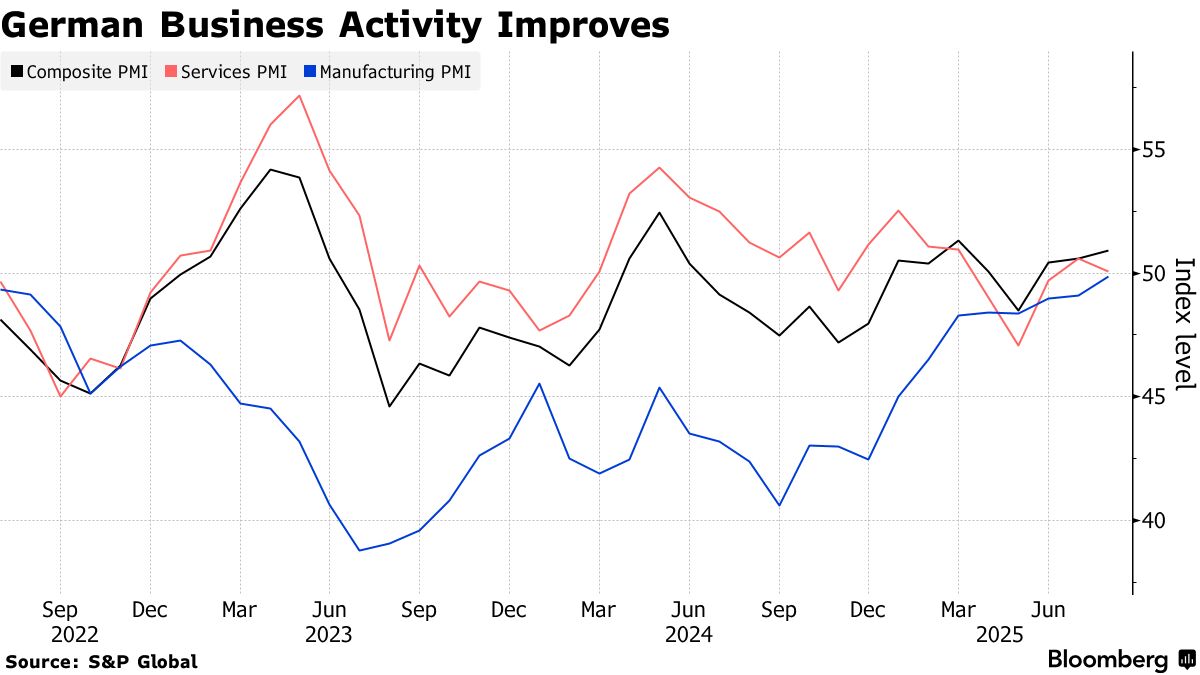 Hoạt động khu vực tư nhân Đức bất ngờ tăng tốc trong tháng 8 khi tình trạng suy thoái kéo dài ba năm trong lĩnh vực sản xuất sắp kết thúc bất chấp thỏa thuận của châu Âu về mức thuế quan cao hơn từ Mỹ.