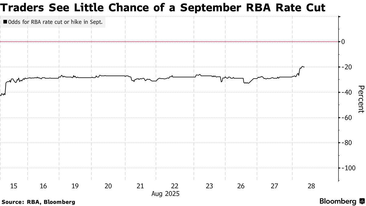 Các hợp đồng hoán đổi liên quan đến cuộc họp của RBA cho thấy ngân hàng trung ương sẽ giữ nguyên lãi suất trong tháng 9, với lần giảm tiếp theo được định giá hoàn toàn vào tháng 11. Các nhà giao dịch sau đó dự kiến một lần cắt giảm vào tháng 5 năm 2026, đẩy lùi kỳ vọng của họ từ tháng 3.