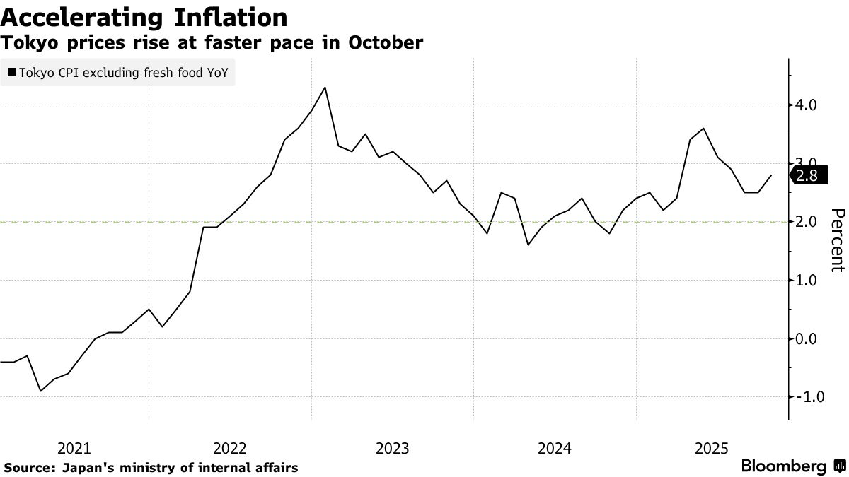 Chỉ số giá tiêu dùng không bao gồm thực phẩm tươi sống tăng 2.8% trong tháng 10 so với cùng kỳ năm trước tại thủ đô, theo Bộ Nội vụ và Truyền thông vào thứ Sáu, với yếu tố chính thúc đẩy sự gia tăng này là chi phí nước. Ước tính trung bình của các nhà kinh tế trong một cuộc khảo sát của Bloomberg là tăng 2.6% sau khi chỉ số này tăng 2.5% trong tháng 9.