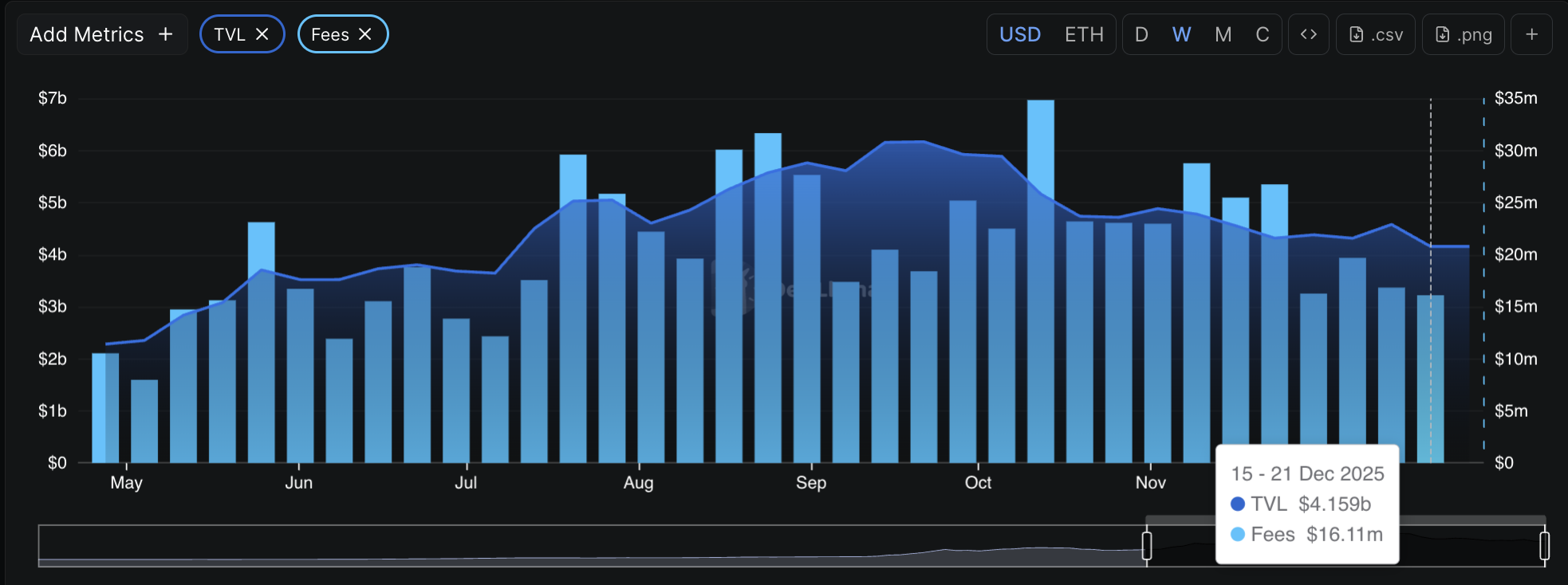 Trong khi đó, dữ liệu từ DeFiLlama cho thấy tổng phí thu được trong tuần trước đạt 16.11 triệu USD, mức thấp nhất theo tuần trong tháng 12. Điều này cho thấy dù số lượng người dùng có phục hồi ngắn hạn, mức phí họ sẵn sàng chi trả lại thấp hơn, phản ánh khẩu vị rủi ro còn dè dặt.