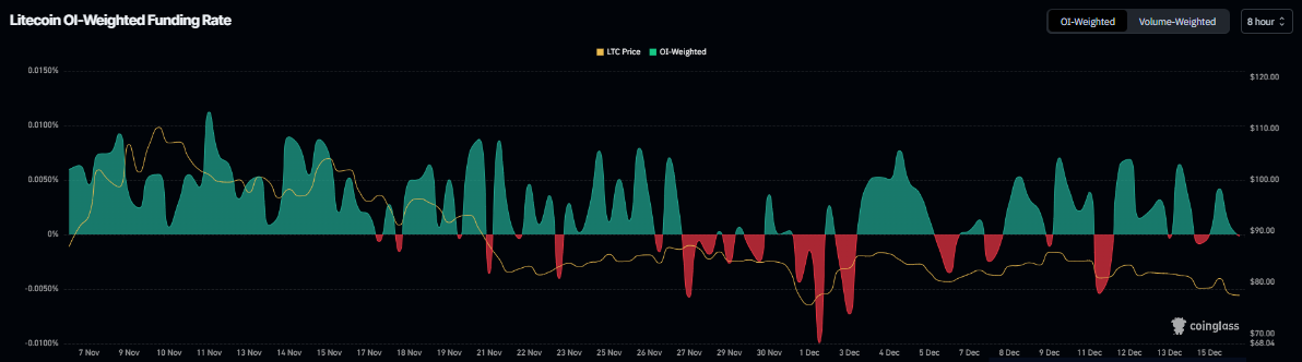 Trên thị trường phái sinh, dữ liệu cũng nghiêng về kịch bản tiêu cực. Tỷ lệ funding theo OI-Weighted của Coinglass cho thấy số lượng nhà giao dịch đặt cược vào đà giảm của LTC đang nhiều hơn nhóm kỳ vọng tăng.