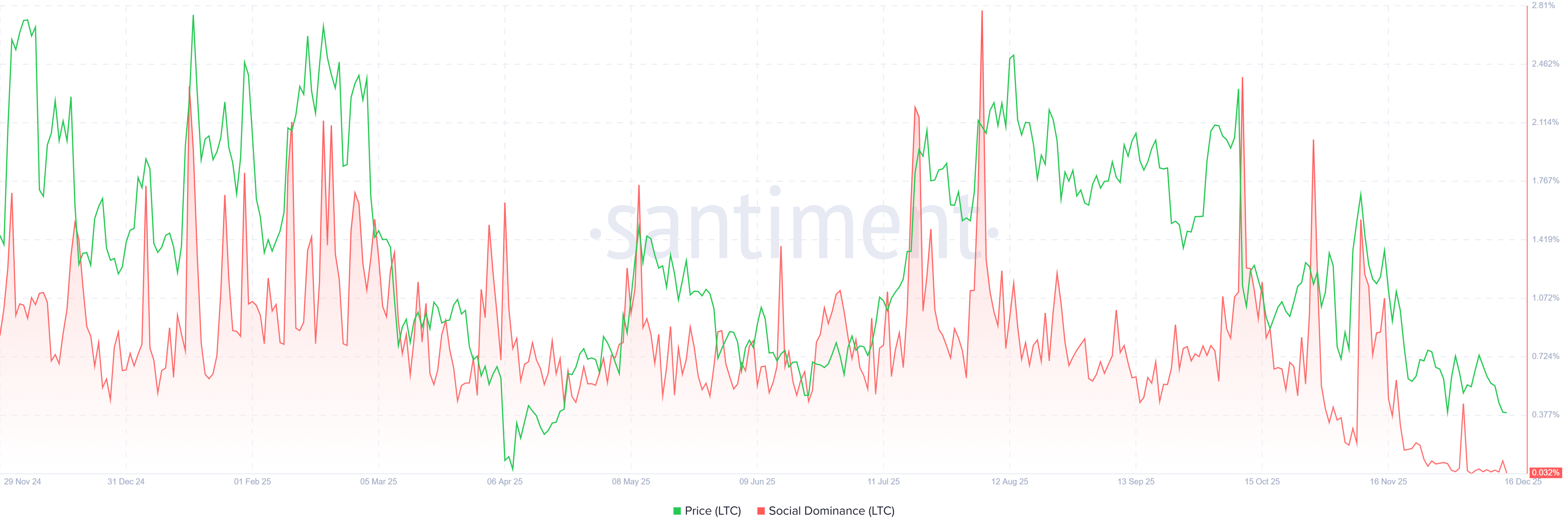 Chỉ số Social Dominance của Santiment đối với Litecoin ủng hộ quan điểm giảm giá. Chỉ số này đo lường tỷ lệ thảo luận liên quan đến LTC trên các nền tảng truyền thông tiền ảo. Kể từ đầu tháng 12, chỉ số liên tục suy giảm và chạm mức thấp nhất trong năm là 0.032% vào thứ Ba, cho thấy sự quan tâm của thị trường và tâm lý nhà đầu tư LTC đang yếu đi rõ rệt.