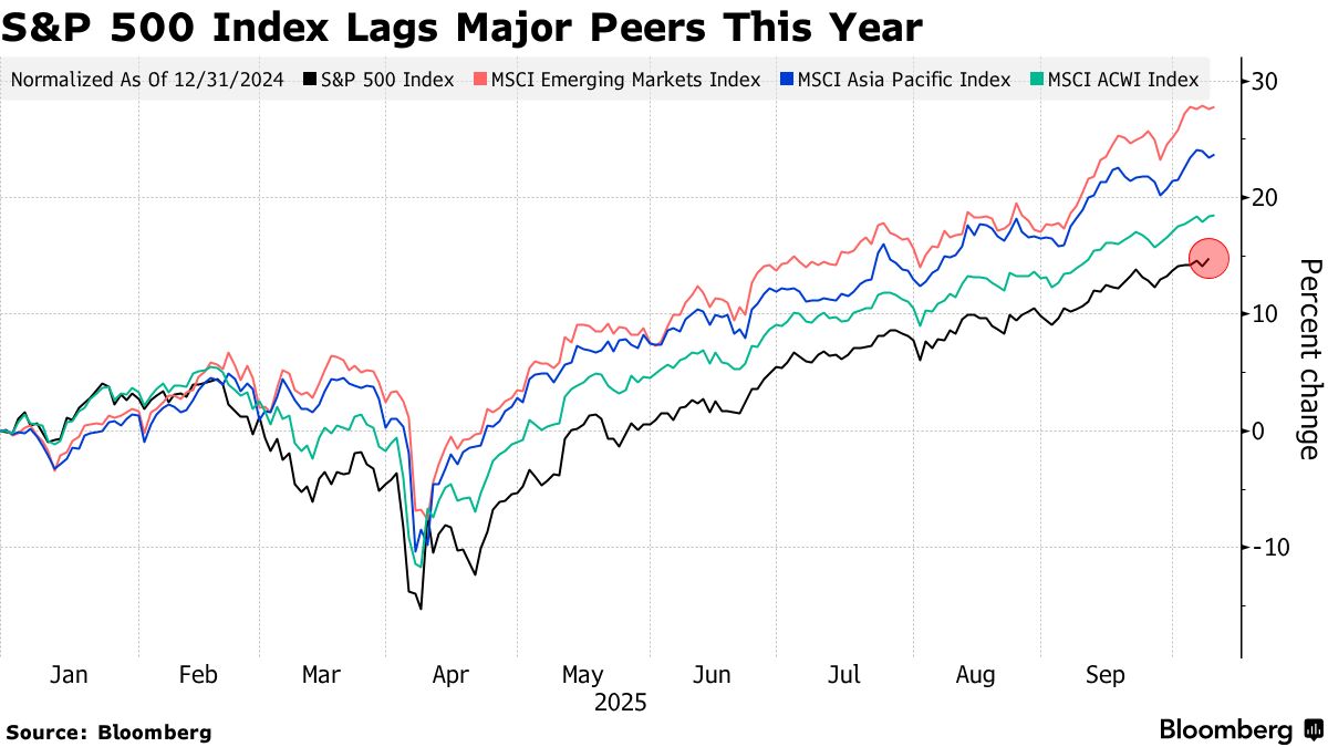 Mặc dù sự lạc quan về trí tuệ nhân tạo đã giúp chỉ số S&P 500 đạt mức cao kỷ lục trong năm nay, nhưng chỉ số chuẩn của Mỹ đang tụt hậu so với các thị trường toàn cầu giữa những nghi ngờ về sự vượt trội của Mỹ. Những lo ngại về tác động của chiến tranh thương mại đối với nền kinh tế Mỹ và thâm hụt tài chính ngày càng gia tăng đang che mờ triển vọng đảo ngược xu hướng này.