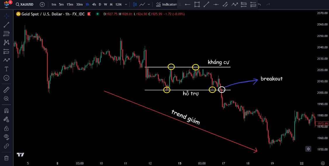 - Khi giá vừa phá vỡ đường kháng cự để di chuyển lên phía trên, ta có thể đặt một lệnh Buy ngay tại khu vực này. Ngược lại, khi các cây nến xuyên thủng hỗ trợ, ta sẽ vào một lệnh Sell tại đây.