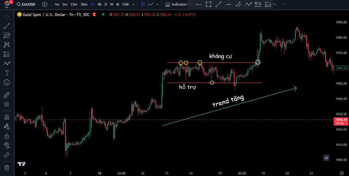 Trong đó, đường kháng cự và hỗ trợ sẽ lần lượt nối ít nhất 2 đỉnh và 2 đáy của các cây nến. Khi giá phá vỡ một trong hai cạnh của hình chữ nhật thì mô hình mới được xác nhận là đã hình thành.