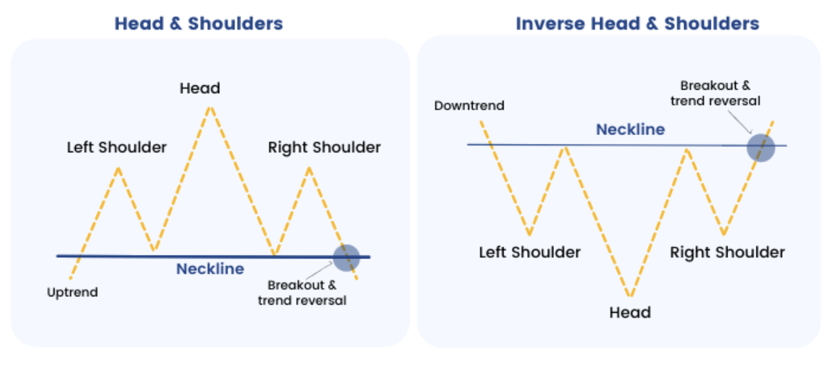 Mô hình vai đầu vai tạo ra một tập hợp với 3 đỉnh và 2 đáy, với đỉnh lớn hơn ở giữa được cho là thời điểm giá sẽ bắt đầu giảm và khi giá phá vỡ đường viền cổ, các nhà giao dịch theo xu hướng giảm tiến hành vào lệnh bán.