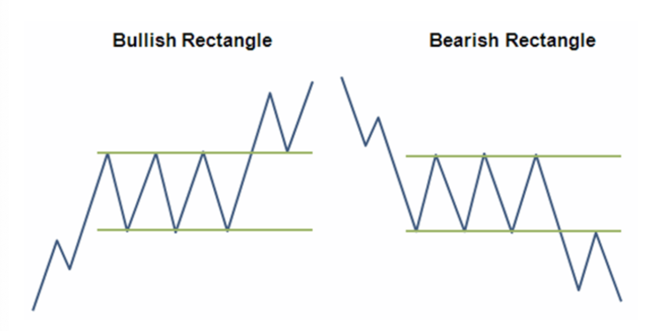 Mô hình chữ nhật (Rectangle Pattern): xuất hiện khi giá “mắc kẹt” giữa hai đường hỗ trợ và kháng cự song song và tạo thành một hình chữ nhật. Đường kháng cự và hỗ trợ sẽ lần lượt nối ít nhất 2 đỉnh và 2 đáy của các cây nến. Mô hình chữ nhật có 2 loại chính: