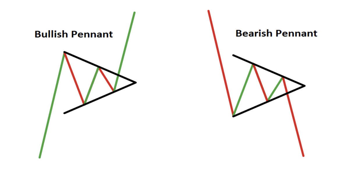 Mô hình cờ đuôi nheo (Pennant Pattern): được hình thành khi giá “mắc kẹt” giữa hai đường xu hướng phụ ngược chiều, nối các đỉnh ngày càng thấp hơn và các đáy ngày càng cao hơn, từ đó tạo hình “lá cờ” (pennant) khi giá dần tiến đến điểm hội tụ. Khi đó, đường xu hướng chính sẽ đại diện cho “cán cờ” (flagpole).