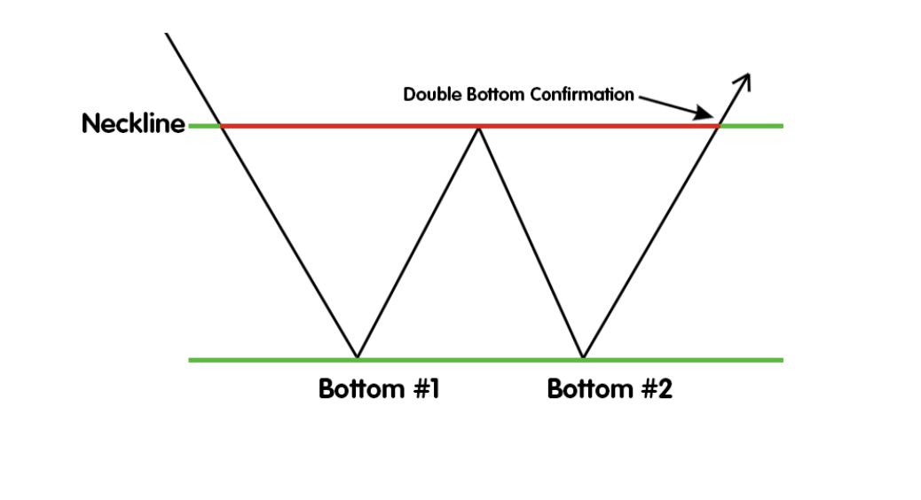 Mô hình hai đáy (Double Bottoms Pattern): có hình dáng giống ký tự “W” với hai đáy liên tiếp có giá trị gần như tương đồng nhau. Nếu giá xuyên thủng đường viền cổ nối hai đáy,được coi là một hỗ trợ cứng, thì giá sẽ sớm đảo chiều tăng và các nhà giao dịch theo xu hướng tăng bắt đầu tiến hành vào lệnh mua.