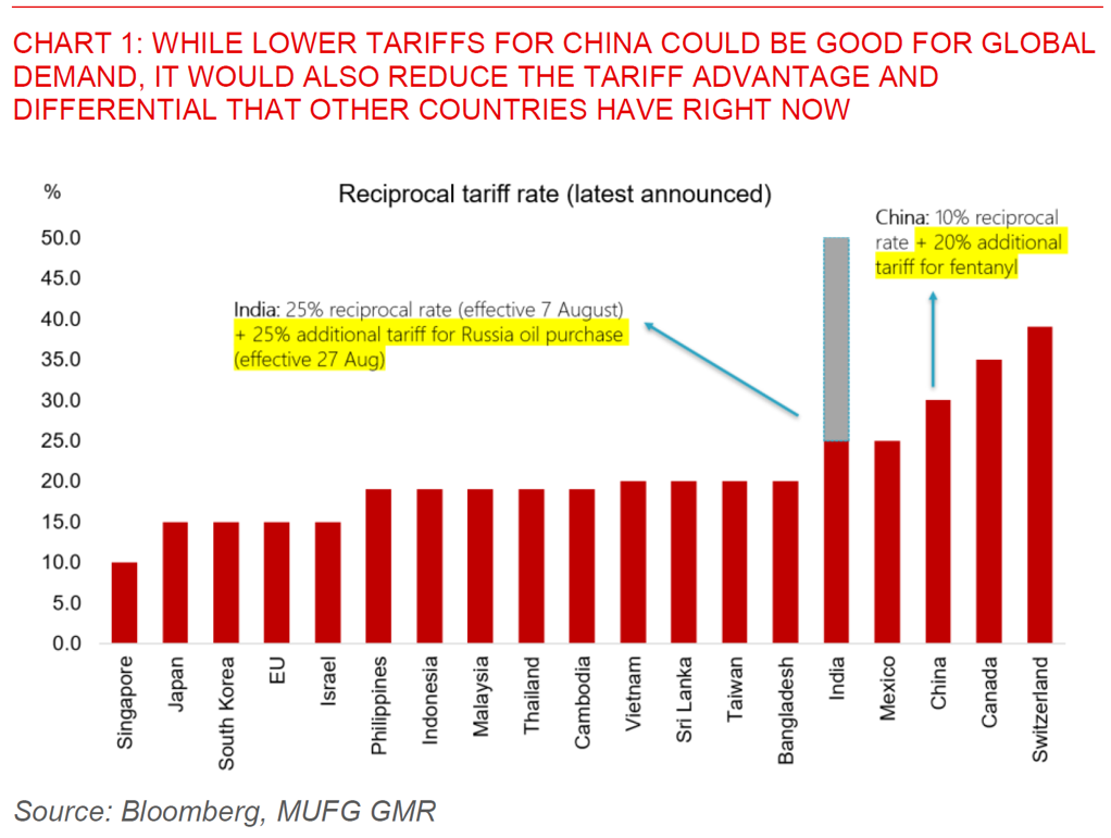 Trước thềm cuộc gặp Trump–Tập, tờ Wall Street Journal cho biết Mỹ có thể dỡ bỏ một phần thuế quan đối với hàng hóa Trung Quốc nếu Bắc Kinh siết chặt việc xuất khẩu các hóa chất dùng để sản xuất fentanyl, theo khuôn khổ dự kiến được thảo luận tại cuộc gặp. Đổi lại, Mỹ có thể giảm mức thuế 20% đối với các mặt hàng liên quan đến fentanyl của Trung Quốc xuống khoảng 10%. Nếu thông tin này là chính xác, đây sẽ là tín hiệu tích cực cho nhu cầu toàn cầu nói chung, qua đó gián tiếp mang lại lợi ích cho các nền kinh tế châu Á khác. Tuy nhiên, việc giảm chênh lệch thuế quan giữa Trung Quốc và các nước châu Á khác cũng sẽ làm giảm lợi thế cạnh tranh hiện tại của các thị trường này. Một phần nguyên nhân khiến các công ty, bao gồm cả doanh nghiệp Trung Quốc, đẩy mạnh đầu tư vào Đông Nam Á là do chênh lệch thuế quan, song còn có các yếu tố cơ cấu khác như tận dụng nhu cầu nội địa, đa dạng hóa chuỗi cung ứng và cải thiện hình ảnh quốc tế.
