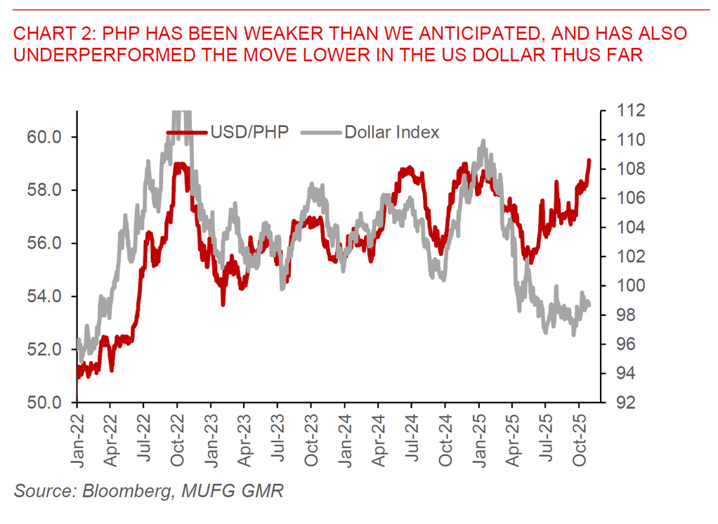 Trước đó, các chuyên gia của MUFG đã dự báo một số trở ngại đối với đồng PHP do định hướng dovish của BSP, cùng với các vấn đề tham nhũng liên quan đến các dự án kiểm soát lũ. Tuy nhiên, mức suy yếu hiện tại của đồng peso lớn hơn dự kiến. Họ từng kỳ vọng các yếu tố tích cực như lạm phát giảm, đầu tư tư nhân mạnh – đặc biệt trong các dự án năng lượng tái tạo, cùng với sự gia tăng dòng vốn FDI từ các khoản phê duyệt trước đó và dòng kiều hối theo mùa – sẽ hỗ trợ đồng peso. Tuy nhiên, điều này vẫn chưa diễn ra. Dù vậy, khi rà soát lại dự báo trong báo cáo Global FX Monthly sắp tới, các nhà phân tích vẫn chưa thấy lý do đủ mạnh để từ bỏ quan điểm rằng USD/PHP có thể giảm trở lại sau giai đoạn suy yếu gần đây.