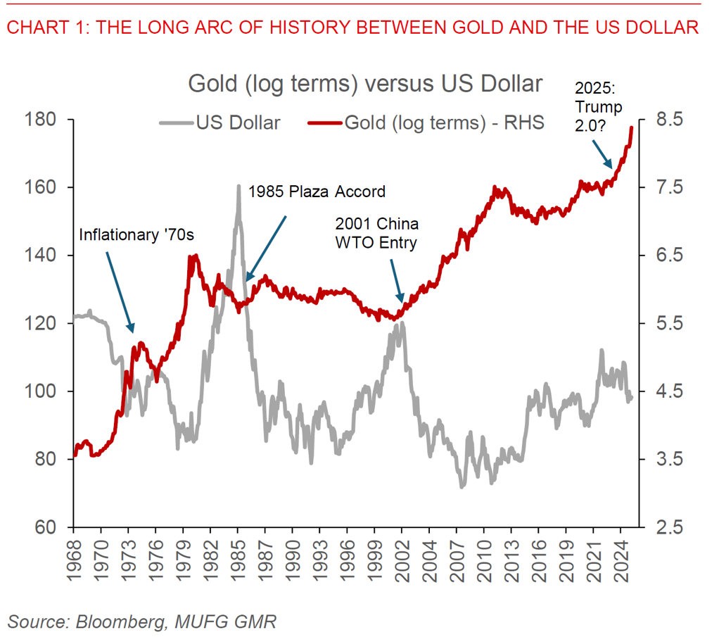 Bức tranh kinh tế vĩ mô lớn hơn còn cho thấy đà tăng đáng kể của giá vàng — dường như không gì có thể ngăn cản được xu hướng này. Dù chưa rõ ai đang mua vàng và vì lý do gì, chúng tôi tin rằng thị trường đang bước vào một giai đoạn có thể chứng kiến những thay đổi lớn và những bước ngoặt quan trọng. Trong lịch sử, các đợt tăng giá mạnh của vàng thường gắn liền với biến động toàn cầu — như sau vụ bong bóng dot-com năm 2001 và việc Trung Quốc gia nhập WTO, hay xa hơn là giai đoạn lạm phát cao thập niên 1970 và thời kỳ sau Hiệp định Plaza năm 1985.