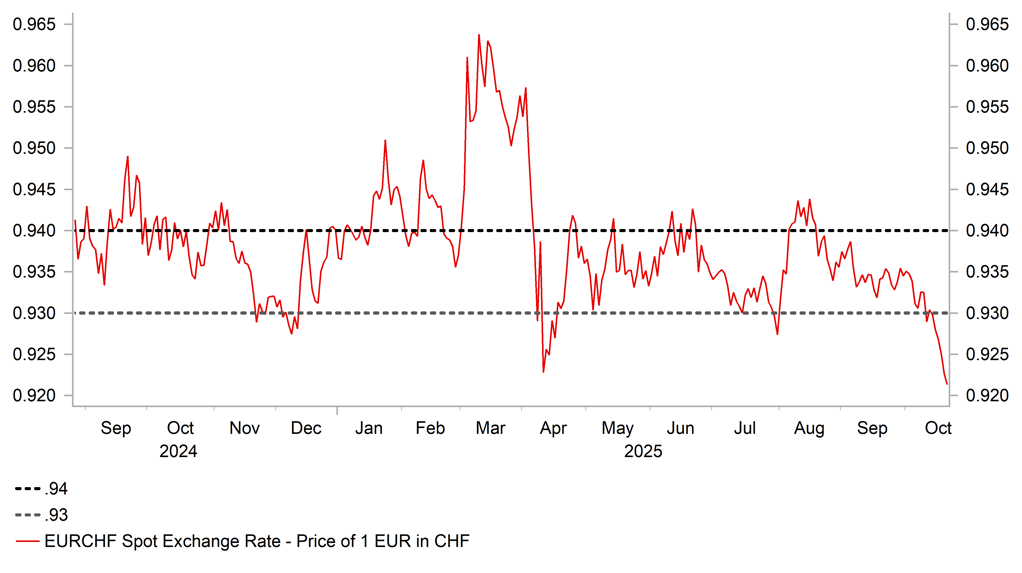 Cùng thời điểm, đồng CHF được hỗ trợ bởi sự gia tăng bất ổn chính trị tại Pháp. Dù Thủ tướng Pháp Lecornu đã vượt qua hai cuộc bỏ phiếu bất tín nhiệm vào tuần trước, ông vẫn đối mặt với thách thức lớn trong việc giành đủ sự ủng hộ để thông qua ngân sách năm tới tại quốc hội. Triển vọng tài khóa của Pháp xấu đi rõ rệt sau khi S&P hạ xếp hạng tín dụng quốc gia này xuống A+ vào cuối tuần trước, nối tiếp quyết định tương tự từ Fitch hồi tháng trước. Tác động tiêu cực ban đầu của việc hạ xếp hạng đối với trái phiếu chính phủ Pháp và đồng euro vẫn tương đối hạn chế.