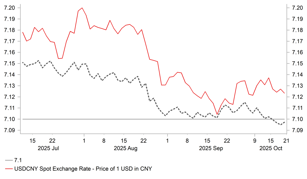 Dữ liệu kinh tế Trung Quốc qua đêm cho thấy tăng trưởng chậm lại trong Q3 sau khả năng phục hồi tốt nửa đầu năm. GDP hàng năm giảm còn 4.8% trong Q3, từ 5.2% Q2. Cục Thống kê Quốc gia cho rằng ba quý đầu tiên đã đặt “nền tảng vững chắc” để đạt mục tiêu tăng trưởng 5% cả năm. Tuy nhiên, nhu cầu nội địa, tiêu dùng và đầu tư vẫn yếu. Bloomberg tính toán đầu tư tài sản cố định giảm bốn tháng liên tiếp đến tháng 9, giảm -0.5% hàng năm trong ba quý đầu. Tăng trưởng bán lẻ chậm lại còn 3.0% hàng năm trong tháng 9, từ 3.4% tháng 8. Bù đắp phần nào là sản xuất công nghiệp tăng bất ngờ 6.5% hàng năm tháng 9, từ 5.2% tháng 8. Dữ liệu được công bố trong bối cảnh lãnh đạo Trung Quốc họp toàn thể lần thứ tư, xây dựng kế hoạch 5 năm tới. Trên thị trường ngoại hối, USD/CNY dao động trong khoảng 7.1000–7.1500, mặc dù PBoC đặt mức cố định hàng ngày dưới 7.1000 trong tuần qua.