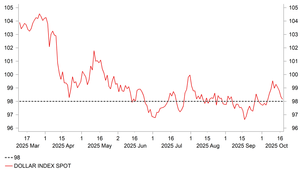 Đồng USD tiếp tục suy yếu qua đêm, kéo chỉ số DXY về gần 98.000, gần như đảo ngược hoàn toàn các khoản tăng đạt được trong tuần trước khi chỉ số từng chạm mức cao 99.563 vào ngày 9 tháng 10. Sự đảo ngược này chủ yếu nhờ giảm bớt bất ổn chính trị tại Pháp và Nhật Bản. Thủ tướng Pháp Sébastien Lecornu đã vượt qua hai cuộc bỏ phiếu bất tín nhiệm sau khi công bố tạm hoãn cải cách lương hưu đến sau cuộc bầu cử tổng thống năm 2027. Cuộc bỏ phiếu đầu tiên do đảng cực tả France Unbowed đề xuất bị bác bỏ với 271 phiếu thuận, chưa đạt đa số 289 phiếu cần thiết. Cuộc bỏ phiếu thứ hai do đảng cực hữu National Rally đề xuất chỉ nhận được 144 phiếu thuận. Những kết quả này tạo điều kiện cho Lecornu xây dựng ngân sách năm tới, dù vẫn chưa rõ liệu ngân sách có được thông qua thuận lợi tại Quốc hội hay không. Bất ổn chính trị có thể bùng phát trở lại vào cuối năm nếu ngân sách năm tới không được phê duyệt.