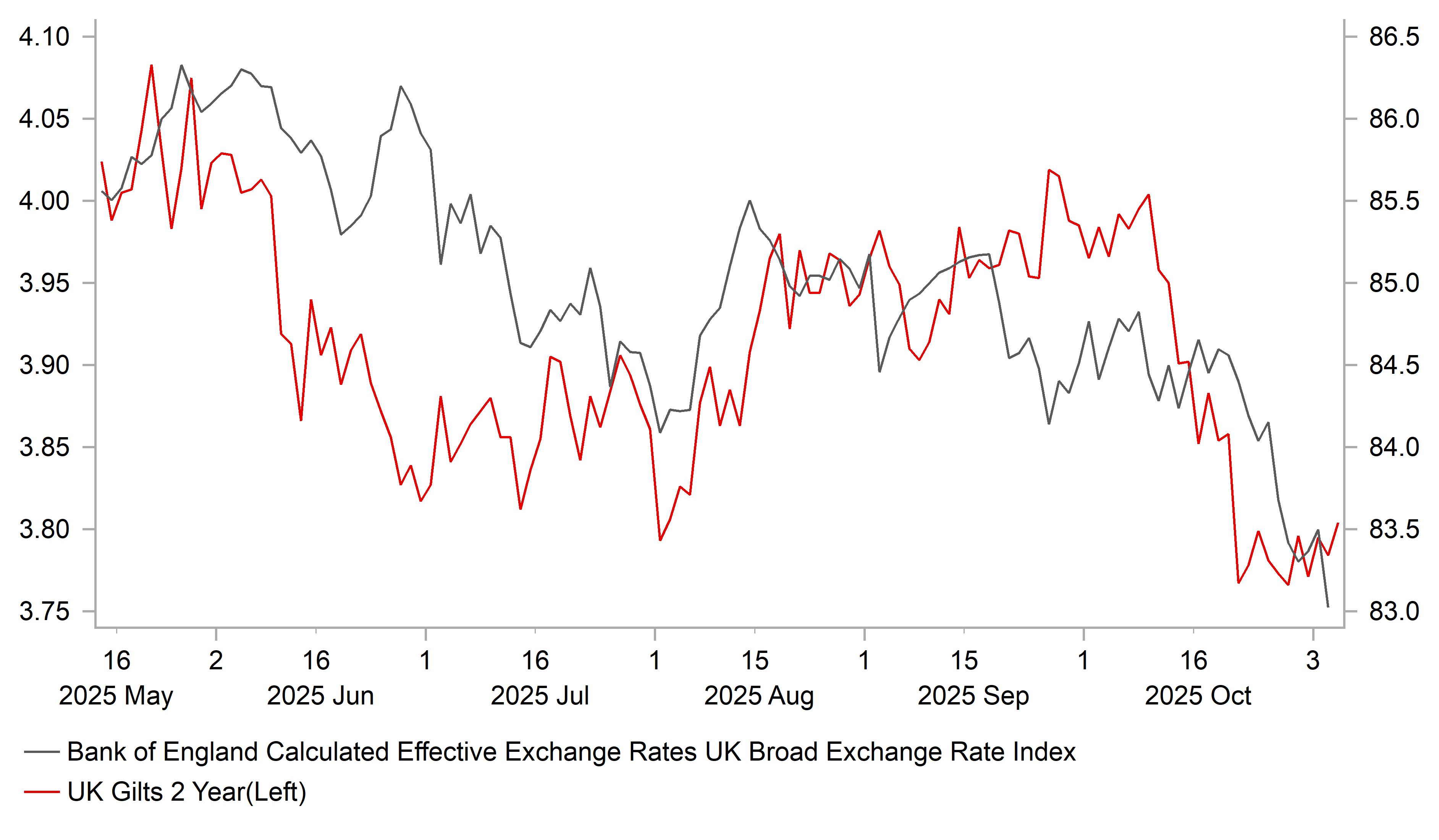 Thị trường lãi suất Anh hiện đang định giá khoảng 6bps cắt giảm cho cuộc họp MPC hôm nay và 17bps cho cuộc họp tháng 12. Điều này phù hợp với nhận định của chúng tôi rằng BoE có thể giữ nguyên lãi suất trong cuộc họp này theo hướng dovish, mở đường cho khả năng cắt giảm vào tháng 12.