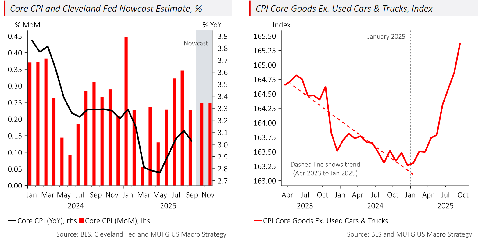 Các mô hình Nowcast CPI dự báo tăng trưởng giá hàng tháng vẫn ở mức cao hơn mức tương thích với lạm phát mục tiêu 2% mỗi năm. Mặc dù lạm phát chung khó tăng tốc (do dịch vụ lõi tiếp tục giảm tốc), các mức thuế quan mới sẽ duy trì áp lực tăng giá lên phần lớn hàng hóa lõi.
