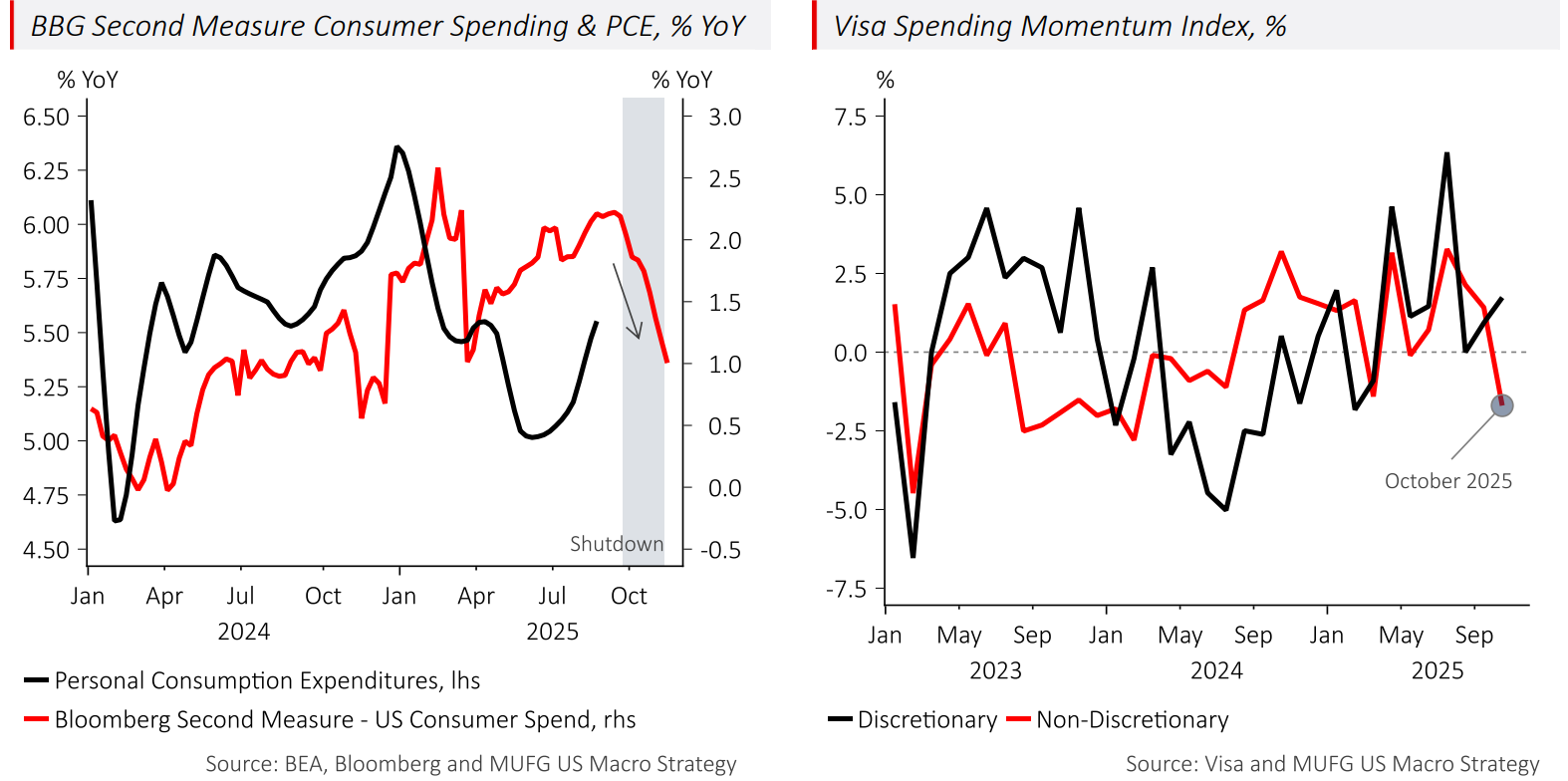 Chi tiêu tiêu dùng nhiều khả năng giảm mạnh trong đầu quý 4 (và xấu hơn bởi việc chính phủ đóng cửa). Đà giảm mạnh trong chỉ số BBG Second Measure (tập trung vào giao dịch thẻ ghi nợ) và chỉ số động lượng chi tiêu không thiết yếu của VISA cho thấy sự suy yếu rõ rệt ở nhóm thu nhập thấp và các hộ có hoàn cảnh khó khăn.