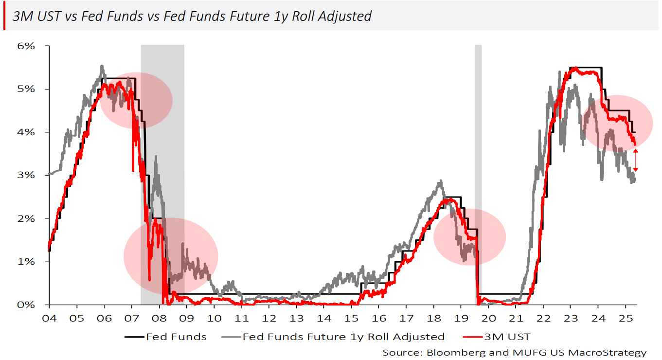 Lãi suất Fed funds kỳ hạn 1 năm đang hình thành đáy cục bộ trong chu kỳ giảm lãi suất và vẫn thấp đáng kể so với lợi suất tín phiếu 3 tháng. Với chính sách hiện tại, tín phiếu 3 tháng ngụ ý hơn một đợt cắt giảm. Để hai đường này hội tụ, thị trường cần loại bỏ bớt các đợt cắt giảm dọc theo đường cong – điều mà thị trường sẽ không thích chút nào!