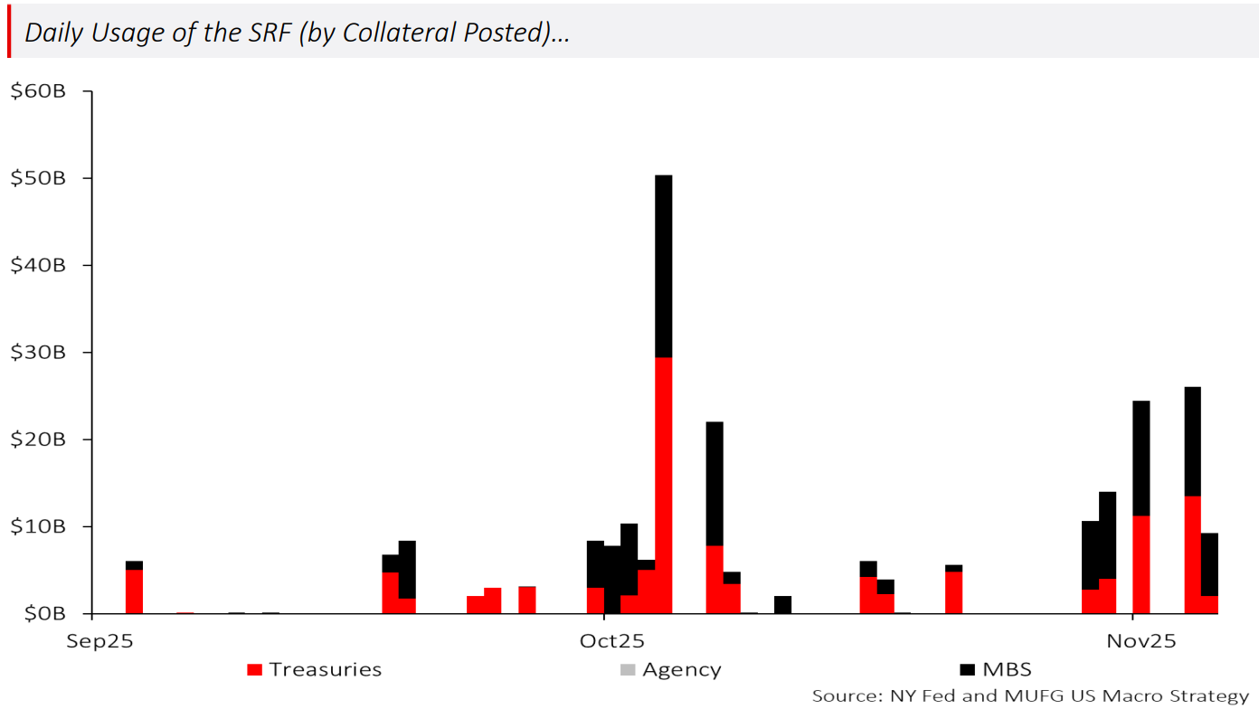 Trong bối cảnh thanh khoản hệ thống ngân hàng Mỹ vẫn dồi dào, câu hỏi đặt ra là vì sao hoạt động vay mượn qua SRF vẫn diễn ra liên tục? Câu hỏi này vẫn chưa được giải thích rõ. KHả năng caon Fed sẽ triển khai thêm biện pháp (hoạt động bổ sung và có thể điều chỉnh lãi suất) trong giai đoạn cuối năm, và sẽ công bố tại kỳ họp FOMC tháng 12.