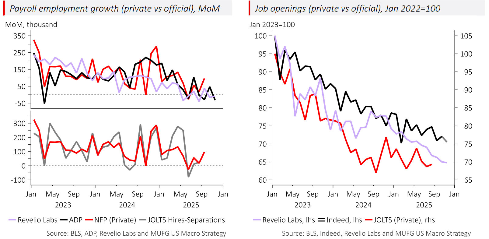 FOMC sẽ không có báo cáo việc làm mới nhất, nhưng dữ liệu thay thế từ Revelio Labs, ADP và Indeed đều cho thấy nhu cầu lao động (tăng trưởng việc làm và số vị trí tuyển dụng) vẫn yếu trong tháng 10 (và có thể trong tháng 11 theo số liệu ADP gần nhất). Ngoài ra, số liệu JOLTS tháng 10 sẽ được công bố, trong đó “tuyển dụng trừ nghỉ việc” phản ánh mức thay đổi việc làm – một chỉ báo gần tương đương NFP.