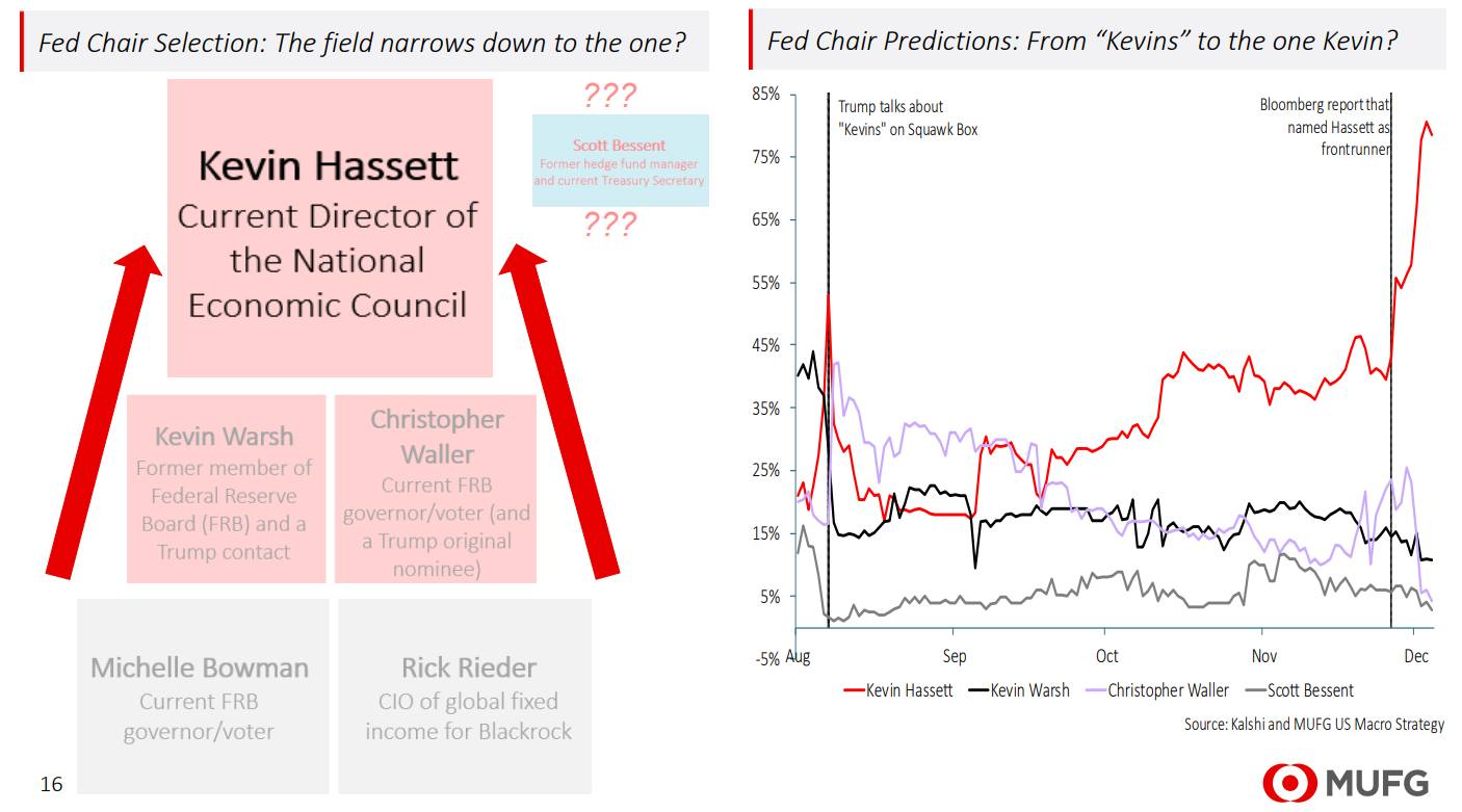 Các trang dự đoán đang chuyển sang khả năng Kevin Hassett – Giám đốc Hội đồng Kinh tế Quốc gia – trở thành ứng viên được Tổng thống Trump đề cử cho chức Chủ tịch Fed. Tuy nhiên, khi quá trình được dời sang tháng 1, mọi thứ đều có thể thay đổi. Ngoài ra, nếu danh sách rút gọn chỉ còn “một người”, vậy động lực nào để các ứng viên thuộc Hội đồng Fed hiện tại trở nên dovish hơn?