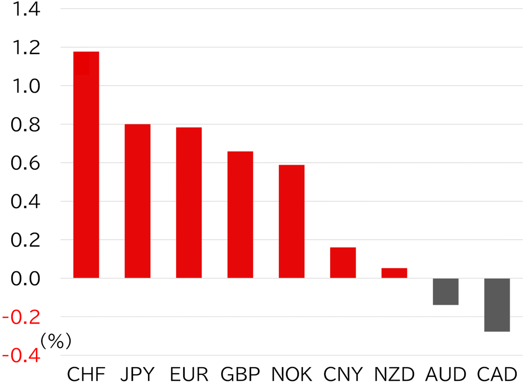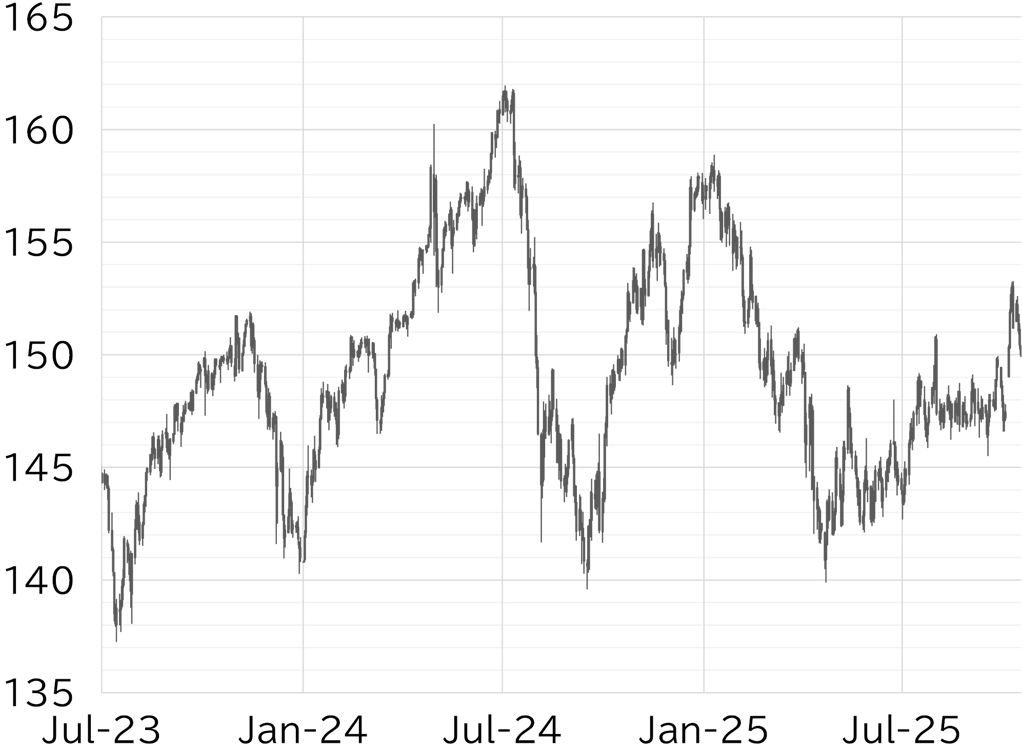 Cặp USD/JPY mở đầu tuần ở mức 152.08. Căng thẳng giữa Mỹ và Trung Quốc leo thang sau khi Trung Quốc áp đặt hạn chế xuất khẩu đất hiếm, nhưng thị trường nhanh chóng ổn định trở lại vào thứ Hai, ngày 13 tháng 10 — kỳ nghỉ lễ tại Nhật Bản — sau khi Tổng thống Mỹ Donald Trump hạ giọng trong lập trường với Bắc Kinh. Trong phiên châu Âu cùng ngày, đồng USD mạnh lên, đẩy cặp tỷ giá tăng lên quanh 152.50. Tuy nhiên, tâm lý “risk-off” xuất hiện do giá cổ phiếu giảm, lợi suất trái phiếu đi xuống và nhu cầu mua JPY tăng đã giới hạn đà tăng khi nhà đầu tư Nhật trở lại vào ngày 14 tháng 10. Cặp tỷ giá tiếp tục xu hướng giảm, chủ yếu trong khung giờ Tokyo (châu Á), và rơi xuống dưới 150.50 trong phiên Mỹ ngày 16 tháng 10, do lo ngại về tình hình tín dụng của các ngân hàng khu vực Mỹ. Tính đến sáng 17 tháng 10 tại Tokyo, USD/JPY đang thử phá vỡ xuống dưới mốc 150 (Hình 1). Trong nhóm tiền tệ G10 tuần này, đồng USD suy yếu trên diện rộng, trong khi CHF và JPY mạnh lên, phản ánh rõ nét tâm lý “risk-off” (Hình 2).