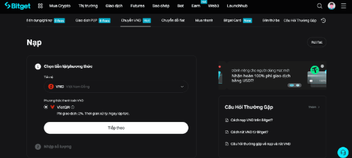 Đăng nhập vào tài khoản Bitget đã xác minh danh tính. Chọn mục Mua Crypto hoặc Nạp tiền pháp định (Deposit Fiat). - Chọn VND làm đơn vị tiền tệ