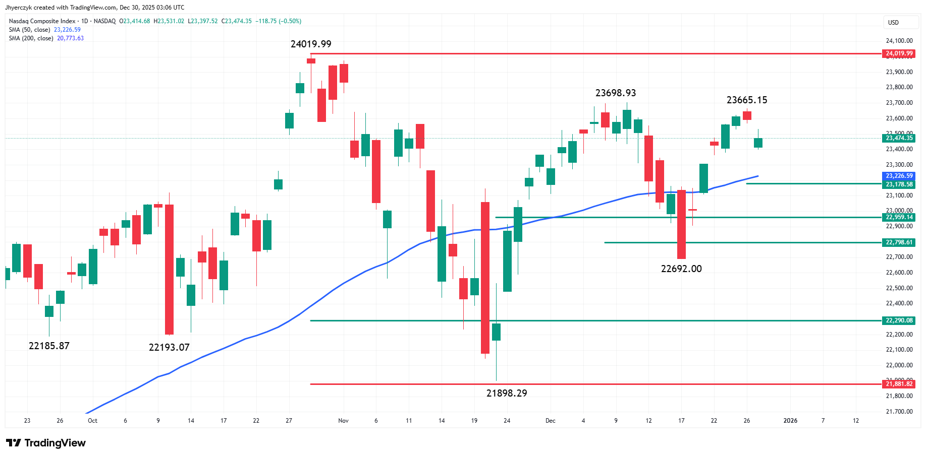 Nasdaq hình thành đỉnh thấp mới tại 23,665.15, làm gia tăng rủi ro đà tăng dịp Giáng Sinh bị gián đoạn khi nhóm cổ phiếu công nghệ chịu áp lực bán cuối năm. Sự suy yếu của cổ phiếu công nghệ cùng với đà lao dốc của kim loại quý đã kéo hoạt động bán lan rộng trên các chỉ số chứng khoán Mỹ, khi nhà đầu tư tiến hành tất toán và cân bằng lại vị thế trước thềm năm mới. Khối lượng giao dịch được dự báo duy trì ở mức thấp cho đến cuối năm, dù Dow Jones và S&P 500 vẫn đang hướng tới tháng tăng thứ tám liên tiếp bất chấp diễn biến kém tích cực gần đây.