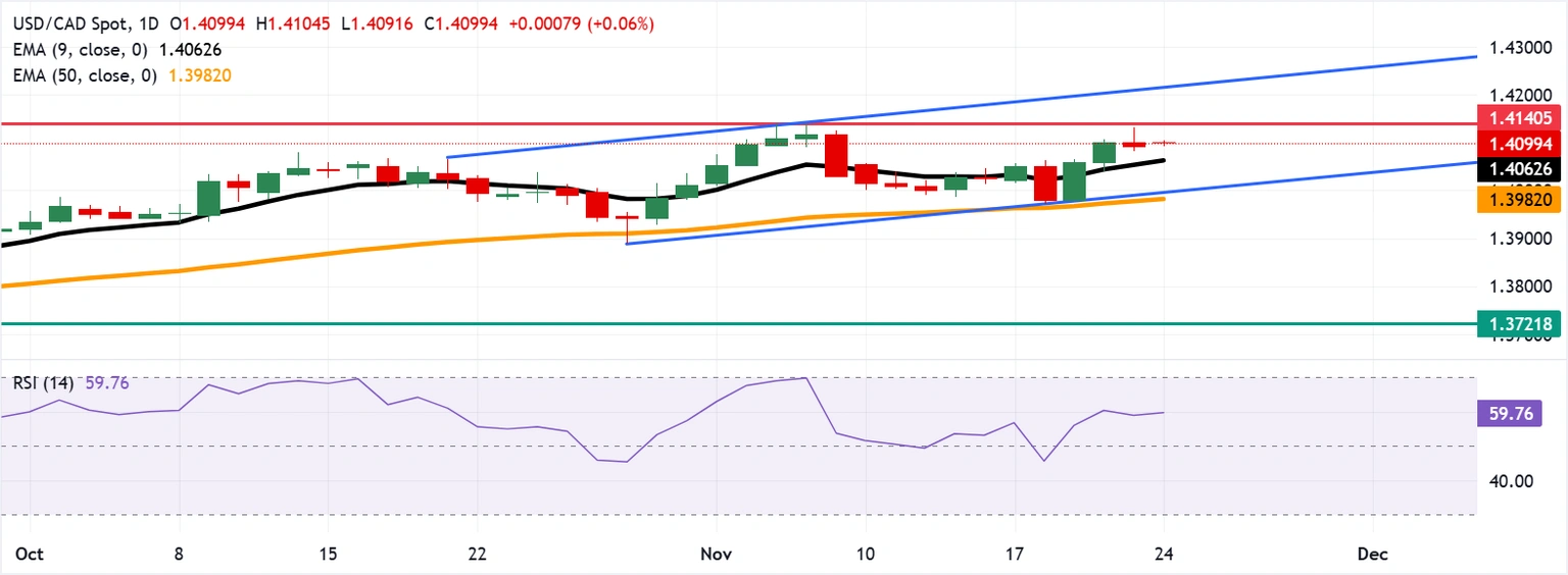 USD/CAD đang phục hồi từ đợt giảm trước đó, giao dịch quanh 1.4100 trong phiên châu Âu thứ Hai. Thiết lập kỹ thuật trên khung ngày cho thấy xu hướng tăng bền vững khi cặp tiền vẫn nằm trong kênh tăng dần. RSI 14 ngày đang tăng và duy trì trên vùng giữa tại 59.9, củng cố động lực tăng.