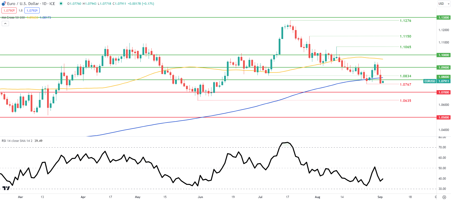 EUR/USD trong biểu đồ ngày vẫn nằm dưới ngưỡng tâm lý 1.0800 và đà giảm đang nhắm mục tiệu ở mức đáy đảo chiều 1.0767.
