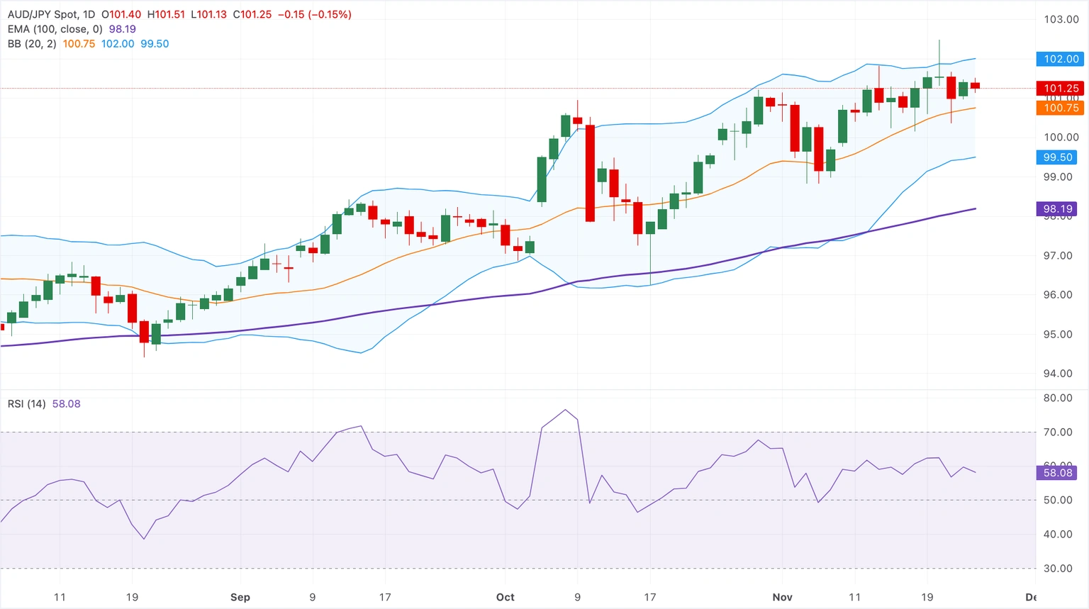 Trên biểu đồ daily, AUD/JPY giao dịch tại 101.25. Giá duy trì trên đường EMA 100 ngày ở 98.19, với xu hướng tăng của đường này tiếp tục củng cố xu thế đi lên. RSI ở mức 58.08, giảm từ 59.66, cho thấy động lượng vẫn tích cực và còn dư địa trước khi chạm vùng quá mua. Giá hiện nằm trên dải Bollinger giữa tại 100.75 và dưới dải trên ở 102.00. Các dải Bollinger mở rộng theo hướng tăng, phản ánh áp lực tăng bền vững nhưng có kiểm soát.