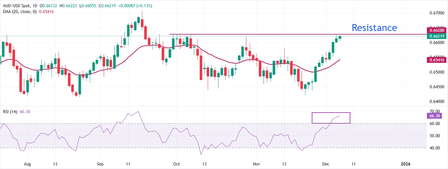 AUD/USD tăng lên gần 0.6620 nhờ đồng AUD tiếp tục vượt trội. Thống đốc RBA Bullock vẫn để ngỏ khả năng tiếp tục thắt chặt chính sách tiền tệ. Nhà đầu tư có vẻ tin tưởng rằng Fed sẽ cắt giảm lãi suất vào tuần tới.