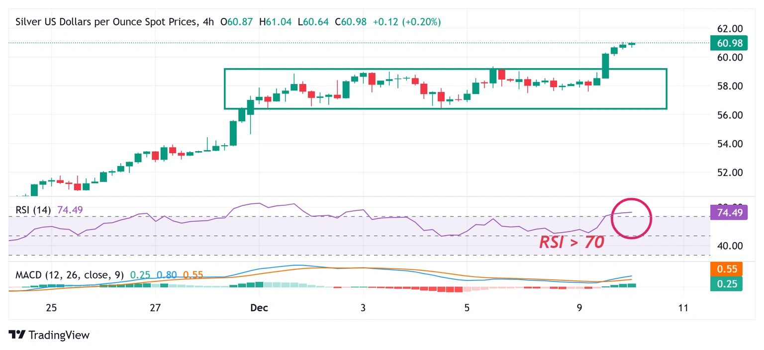 Pha phá vỡ qua vùng cản của phạm vi giao dịch tháng quanh $58.80-$58.85 trong phiên đêm qua đã tạo thêm động lực cho phe mua XAG/USD. Tuy nhiên, chỉ báo RSI đang ở vùng quá mua trên khung ngày và khung 4 giờ, khiến nhà giao dịch thận trọng hơn với các lệnh mua bổ sung. Do đó, việc chờ một nhịp đi ngang củng cố hoặc một đợt pullback nhẹ trước khi định vị cho pha tăng tiếp theo được xem là hợp lý.