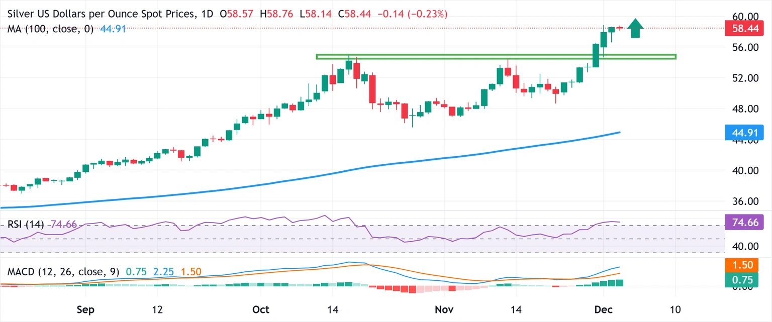 Nhận định giá bạc: XAG/USD củng cố dưới vùng giữa $58.00