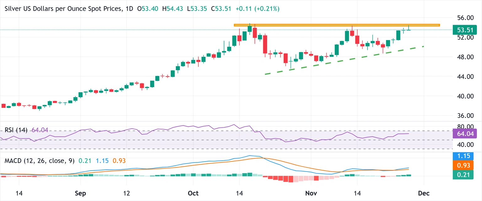 Ở góc độ kỹ thuật, các lần thất bại liên tiếp trong việc duy trì đà tăng và bứt phá ổn định trên vùng kháng cự nằm ngang 54.40-54.50 USD đã hình thành mô hình đa đỉnh trên biểu đồ khung ngày. Tuy nhiên, các chỉ báo dao động trên biểu đồ này vẫn duy trì trong vùng tích cực, cho thấy cần thận trọng trước khi xác nhận rằng XAG/USD đã hình thành đỉnh ngắn hạn.