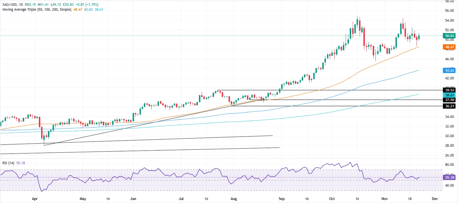 Nhận định giá bạc: XAG/USD phục hồi lên $51.37 khi lợi suất giảm