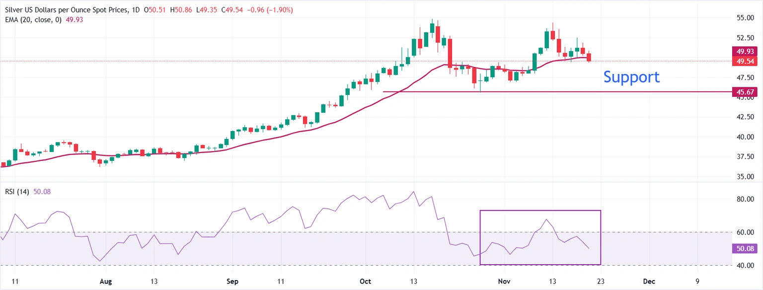 Giá bạc đang gặp khó khăn trong việc giữ trên đường EMA 20 ngày và hiện giao dịch quanh 49.50 USD.
