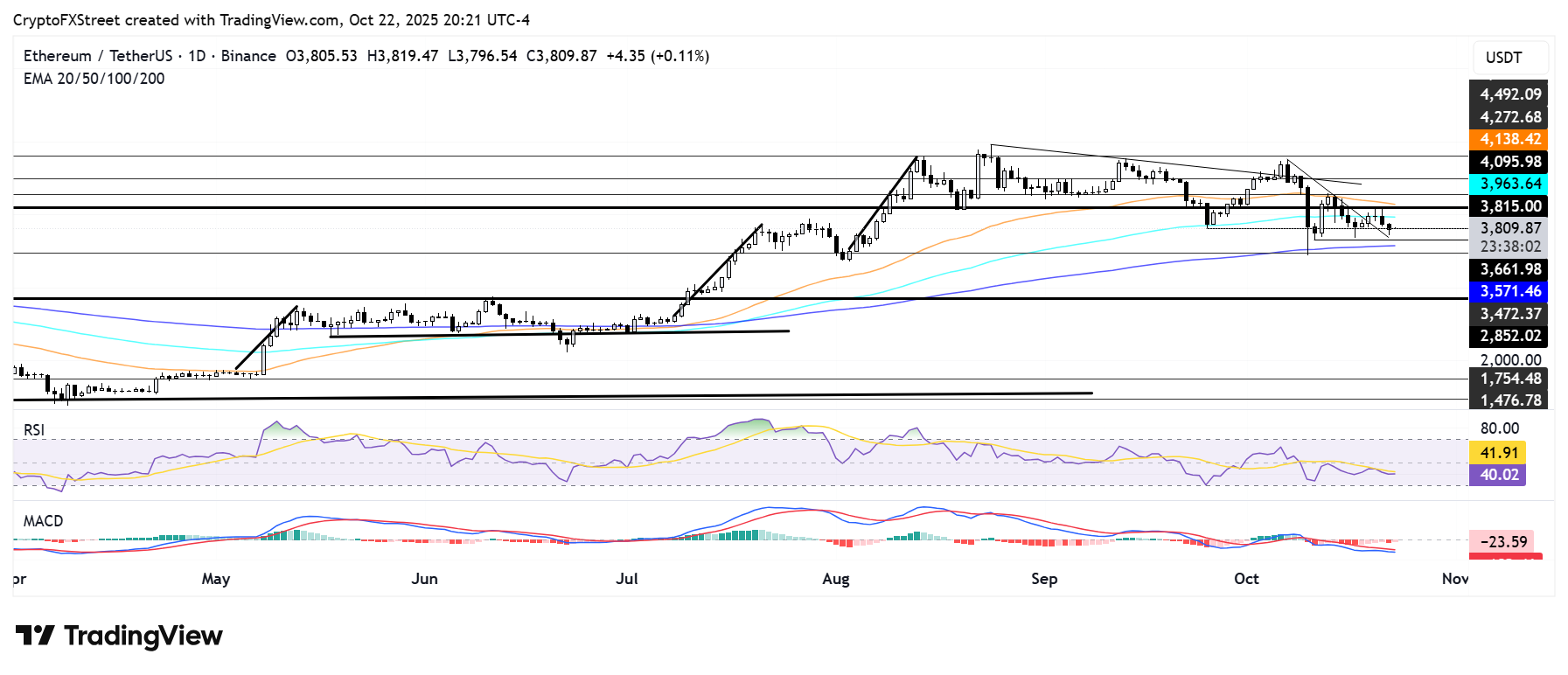 Sau khi bị từ chối tại vùng kháng cự 4,100 USD, ETH giảm xuống dưới mốc hỗ trợ 3,800 USD trước khi bật lên từ đường xu hướng giảm kéo dài từ ngày 7 tháng 10 — ngay trên đường trung bình động hàm mũ (EMA) 200 ngày. Altcoin hàng đầu này hiện đang vật lộn để duy trì hỗ trợ khi áp lực bán vẫn hiện hữu.