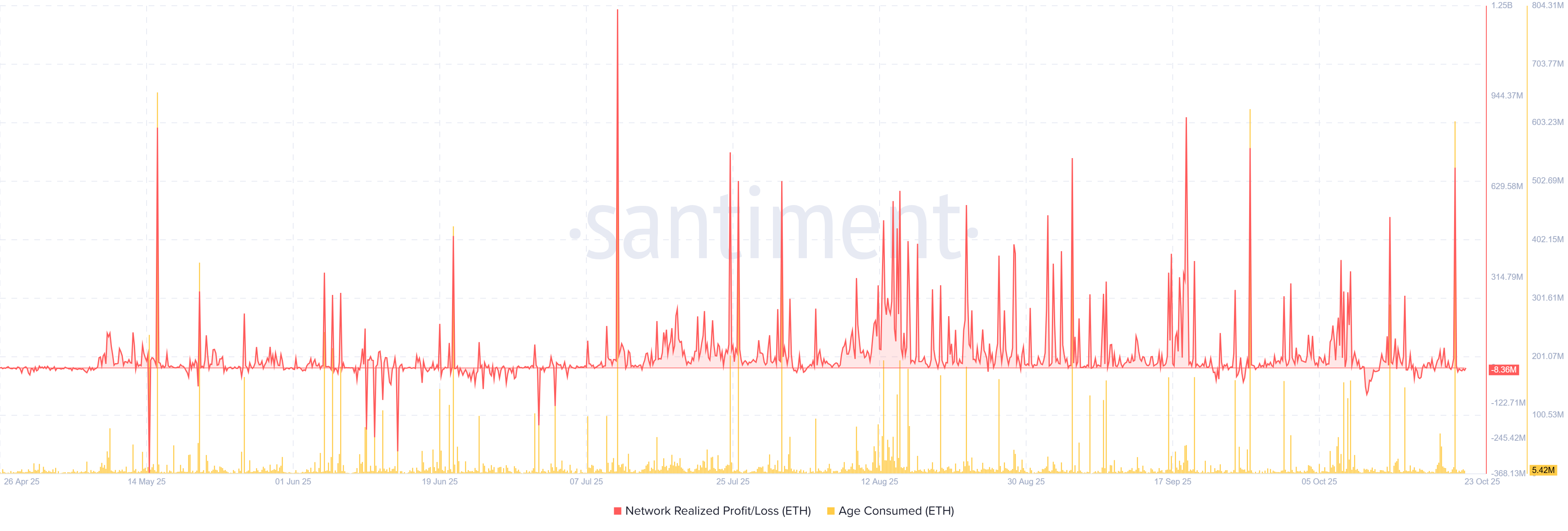 Lợi nhuận/Thua lỗ thực tế của mạng ETH & Age Consumed. Nguồn: Santiment