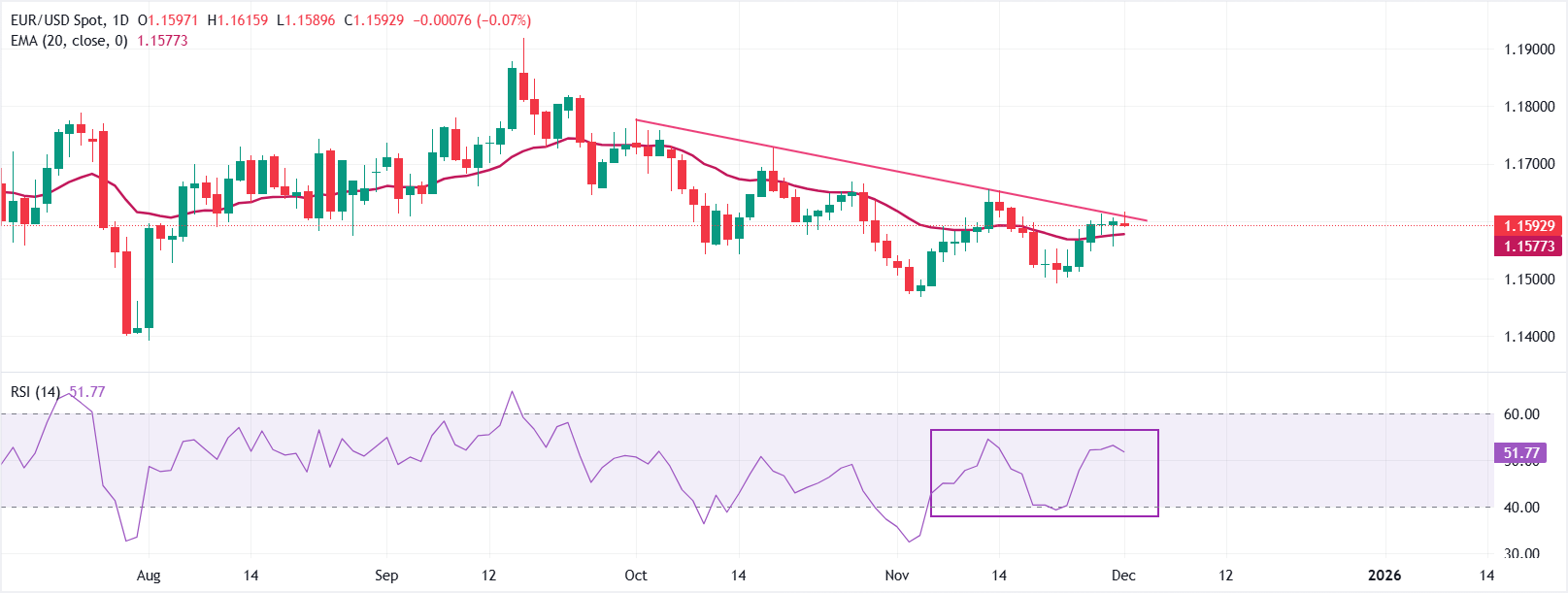 Trên biểu đồ hàng ngày, EUR/USD giao dịch tại 1.1593. Đường trung bình động 20 ngày (20-EMA) ổn định quanh 1.1577, với giá duy trì nhẹ phía trên và đà tăng nhẹ cho thấy xu hướng ngắn hạn đang cải thiện. Đường xu hướng giảm từ đỉnh 1.1776 vẫn giới hạn đà tăng, với kháng cự gần 1.1606. Chỉ báo RSI ở mức 51.8 (trung tính), phản ánh động lượng cân bằng sau nhịp hồi giữa tháng.