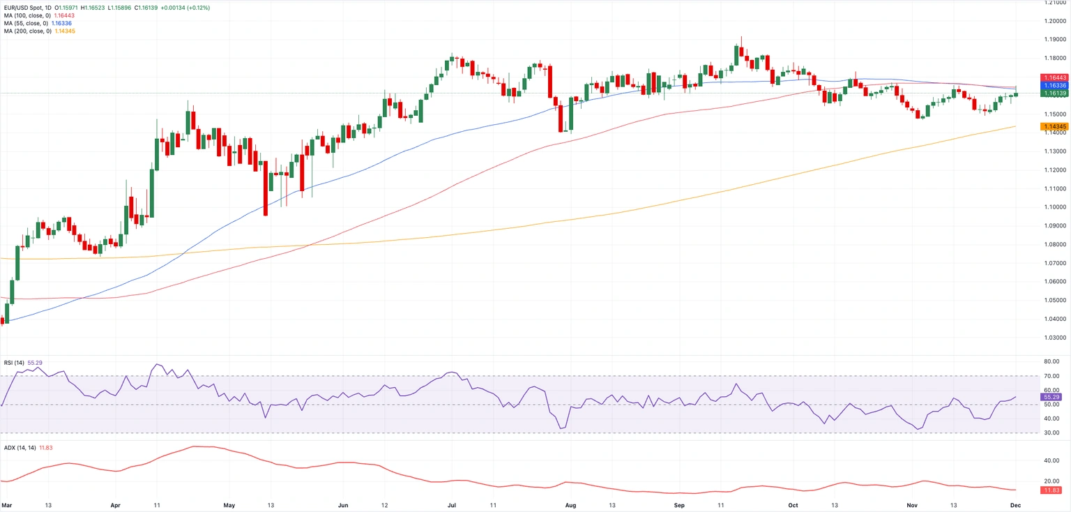 EUR/USD chạm đỉnh ba tuần trong vùng 1.1650–1.1660 vào thứ Hai. Đồng đô la Mỹ giữ xu hướng giảm rõ rệt bất chấp lợi suất trái phiếu Mỹ cao hơn. Chỉ số ISM Manufacturing PMI của Mỹ giảm dưới kỳ vọng trong tháng 11, ở mức 48.2.