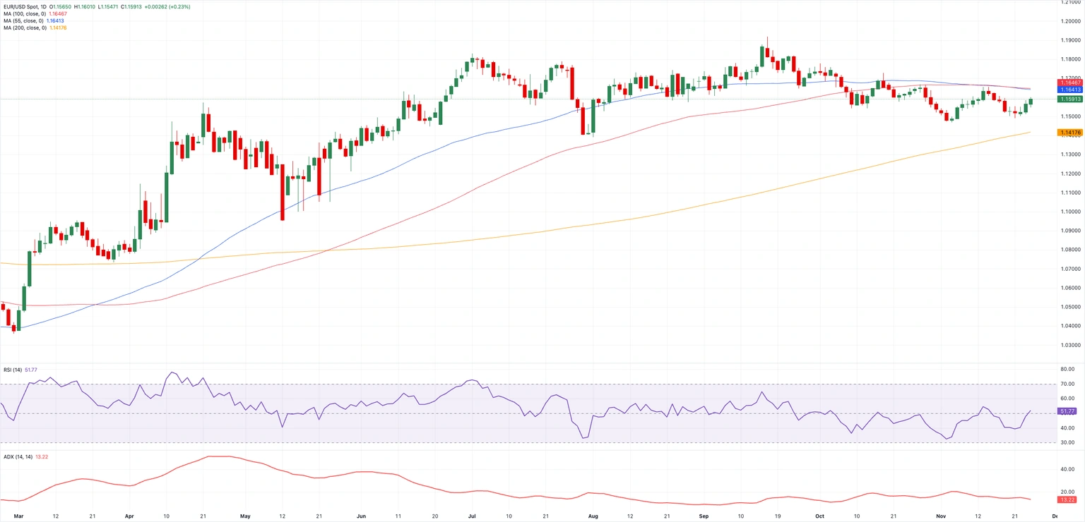 EUR/USD duy trì xu hướng tăng, tiến gần trở lại vùng 1.1600. Đồng USD tiếp tục suy yếu, giảm xuống các đáy nhiều ngày. Thị trường Mỹ sẽ nghỉ giao dịch vào thứ Năm nhân dịp Lễ Tạ Ơn.